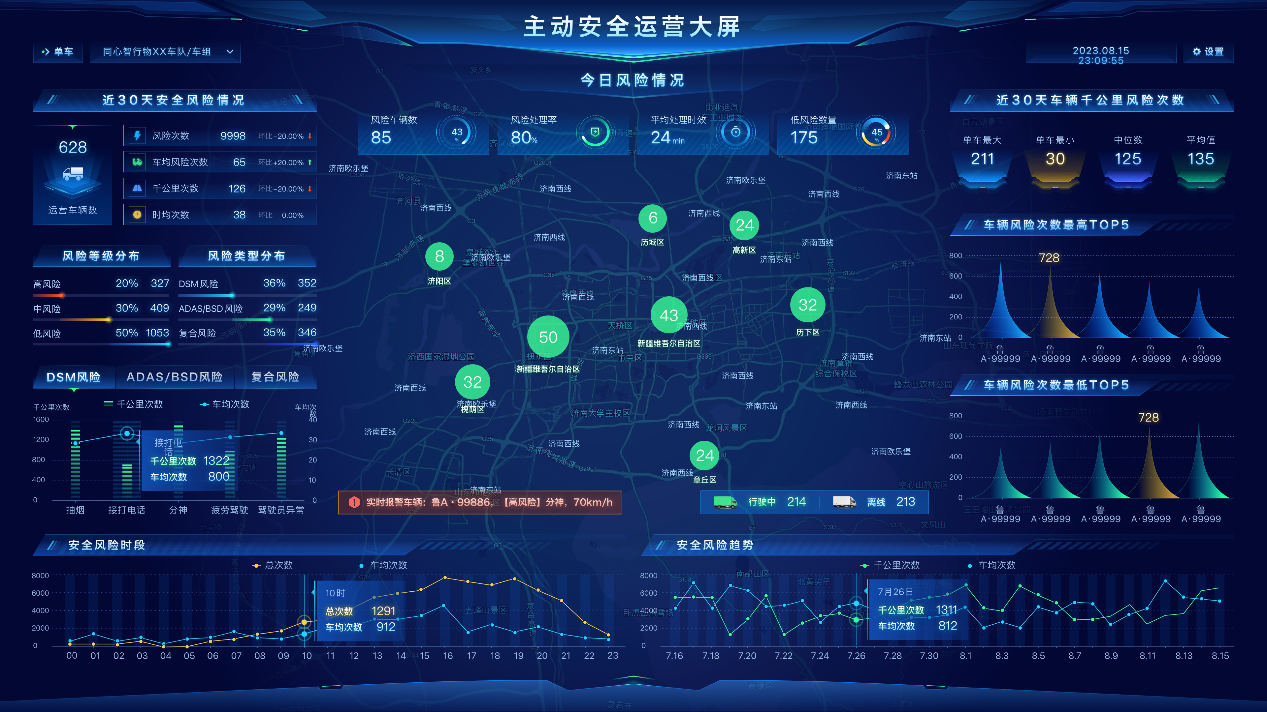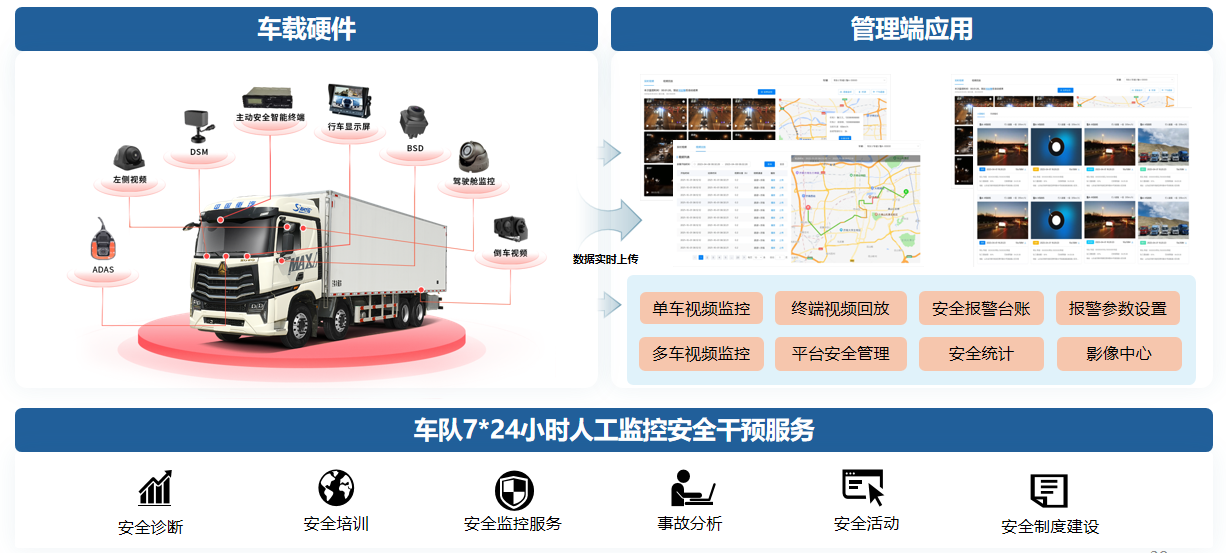 车载硬件全时记录驾驶行为与车辆状态,管理端实时监控、视频回放可追溯,7*24小时人工干预及时制止违规,数据还可用于驾驶员绩效考评;