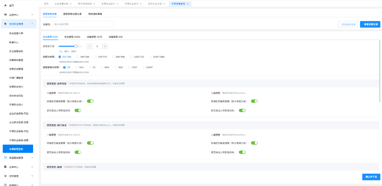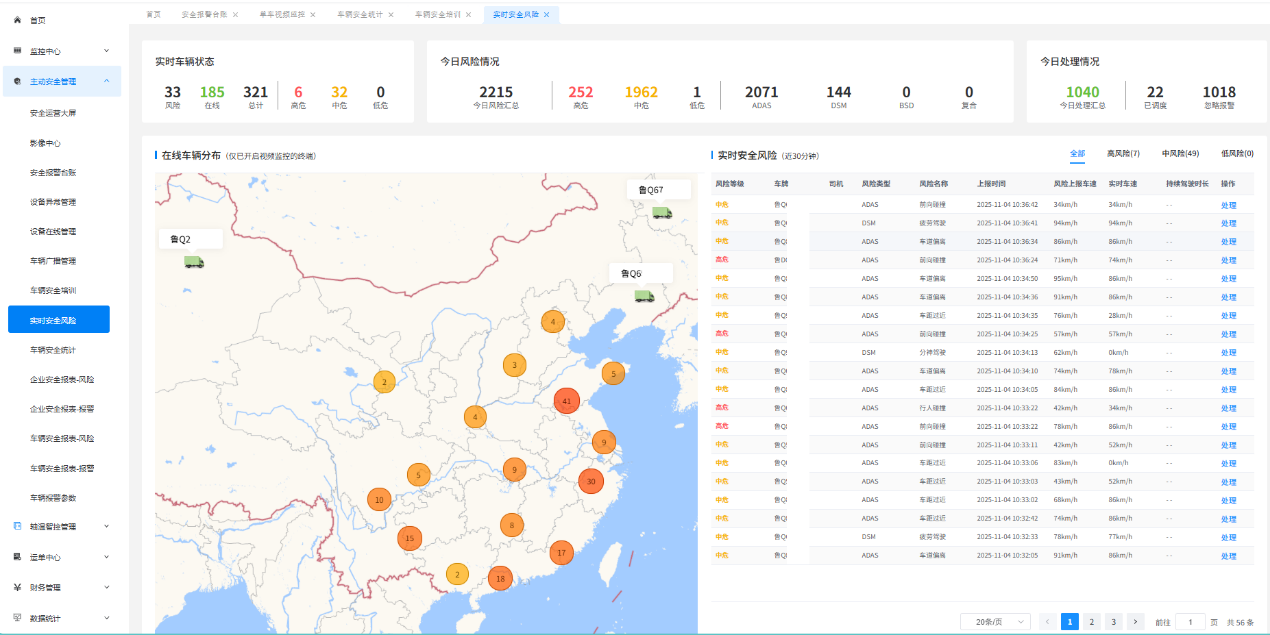 通过智能终端及配套摄像头,平台实时评估行车风险,自动对司机进行语音提醒,同时,上报安全事件到平台,由平台调度人员结合风险等级进行进一步干预,最大程度避免安全事故发生。